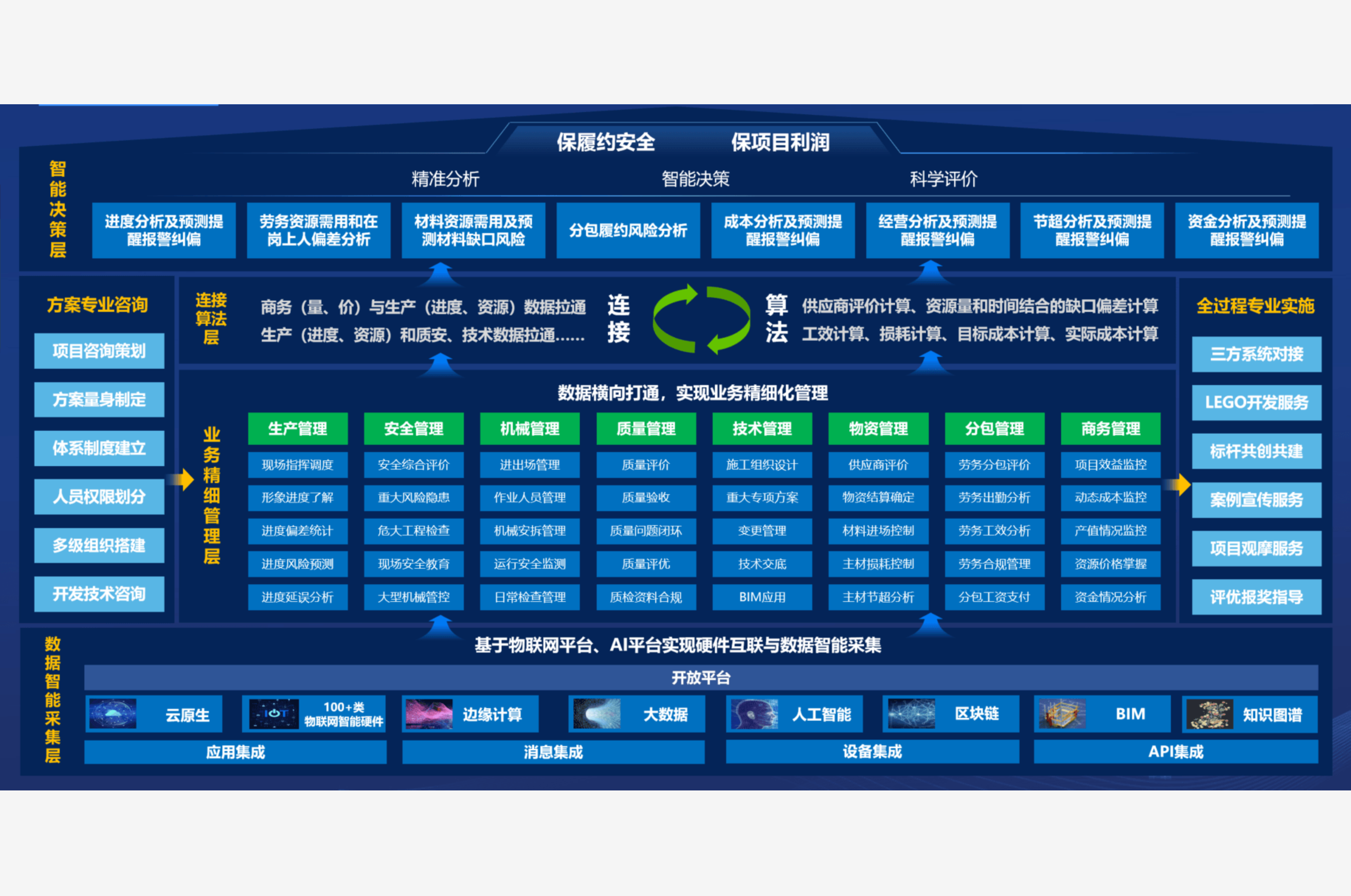产品概述利用IoT、BIM、大数据、AI等核心技术,实时采集现场数据,自动分析建模,精准分析、智能决策、科学评价,形成一套数据驱动的新型管理模式。为施工企业提供生产提效、安全可控、成本节约的项目企业一体化解决方案。 集成平台,统一入口,消除数据孤岛,数据综合分析,业务涵盖企业项目决策分析,生产管理,安全管理,机械管理,质量管理,技术管理,物资管理,分包管理,商务管理,提供综合决策依据。 |