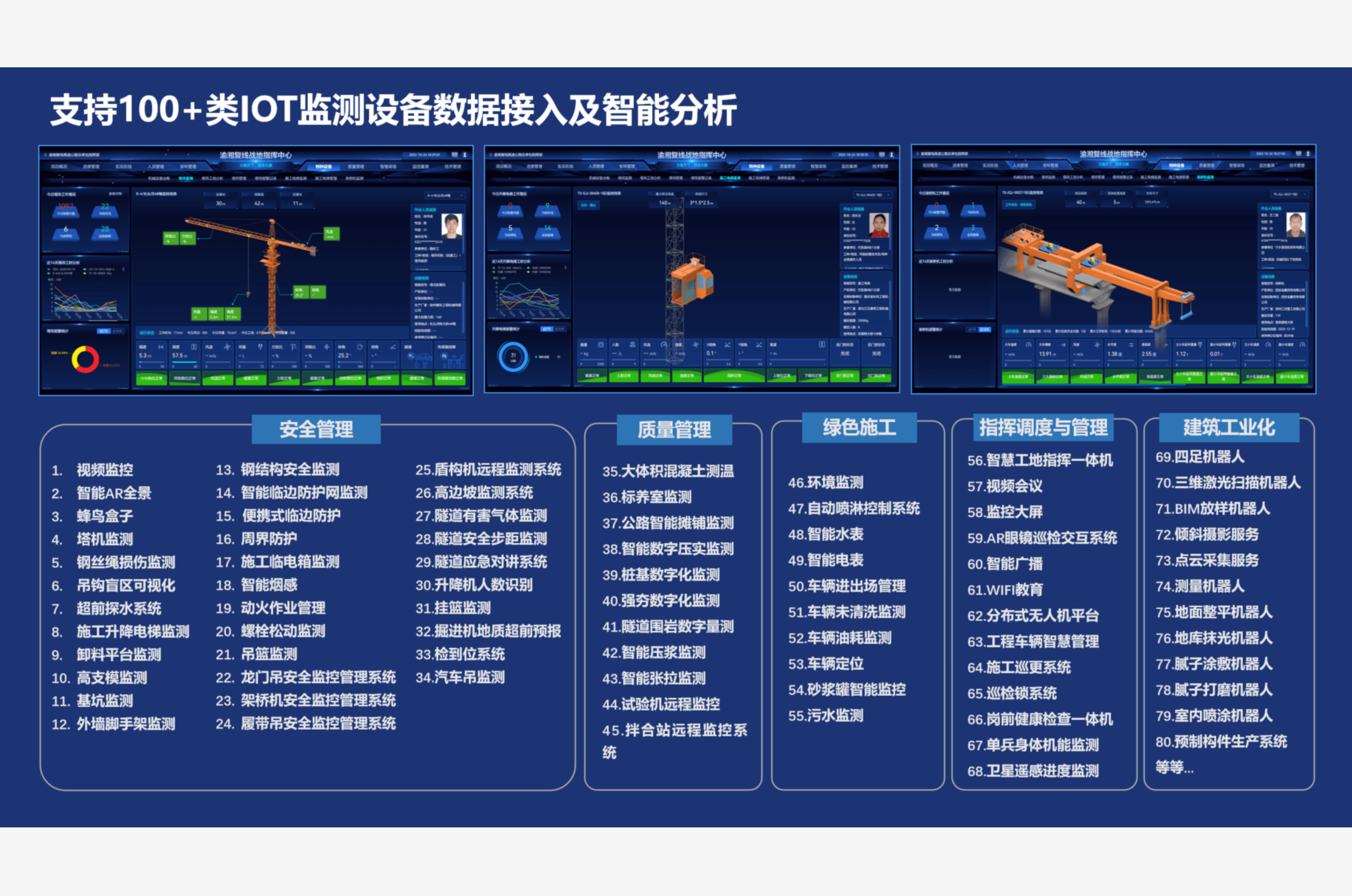 支持100余类IOT设备接入-让项目管理更加智能可控应用物联网技术,接入现场100余类硬件设备,实时监测,及时预警,系统建立硬件报警分析模型,让数据业务化、可视化,让项目管理更可控。 平台已对接各地监管平台,开放对接各司智能硬件和软件系统。 |