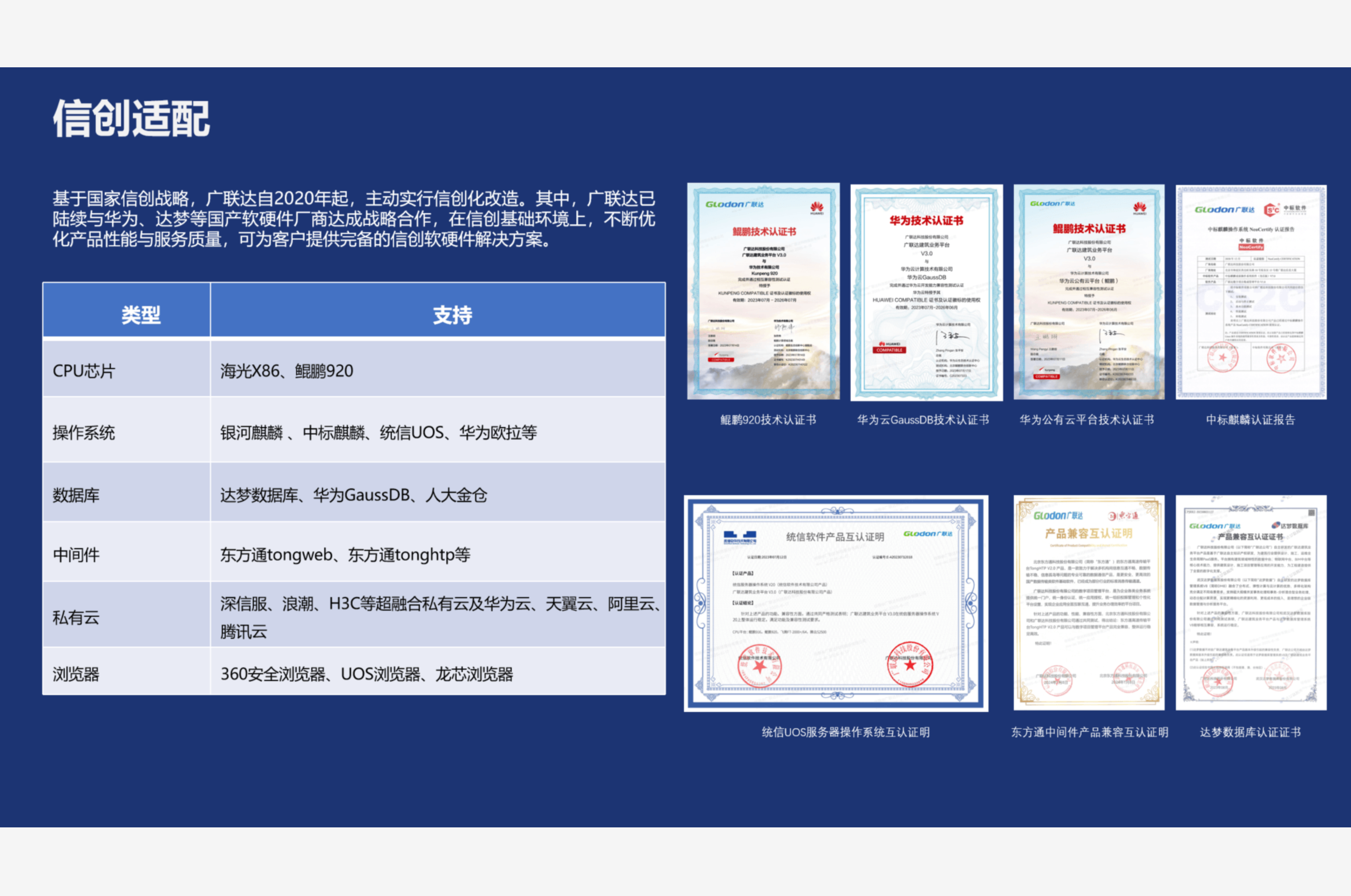 提供完备的信创软硬件解决方案基于国家信创战略,广联达自2020年起,主动实行信创化改造。其中,广联达已陆续与华为、达梦等国产软硬件厂商达成战略合作,在信创基础环境上,不断优化产品性能与服务质量,可为客户提供完备的信创软硬件解决方案。 |